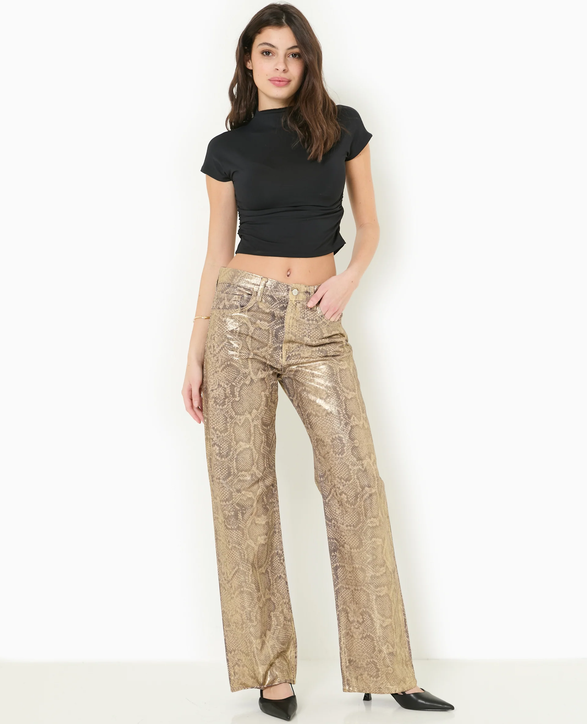 Jean droit motif python enduit doré