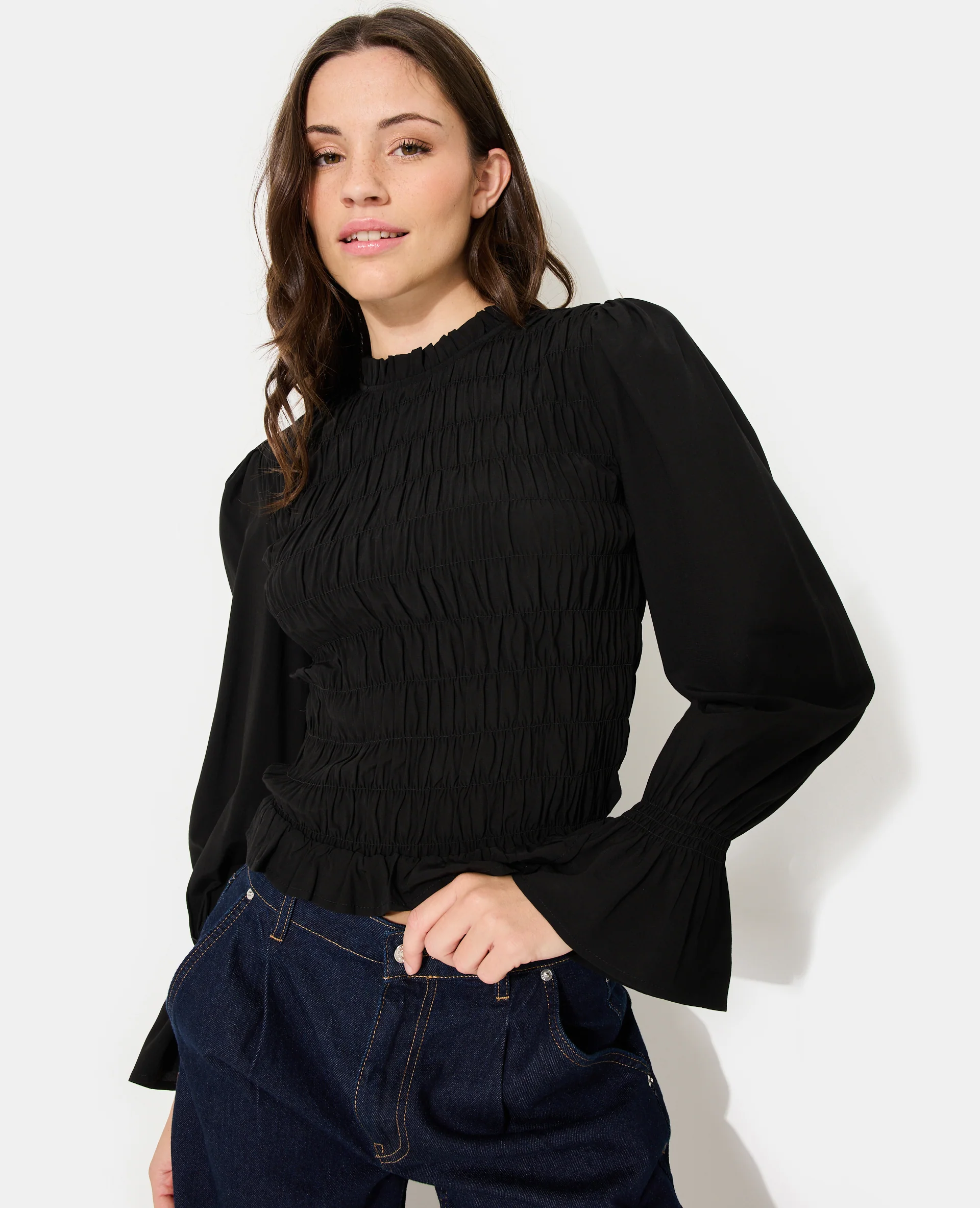 Blouse effet gaufré avec volants et manches ballons