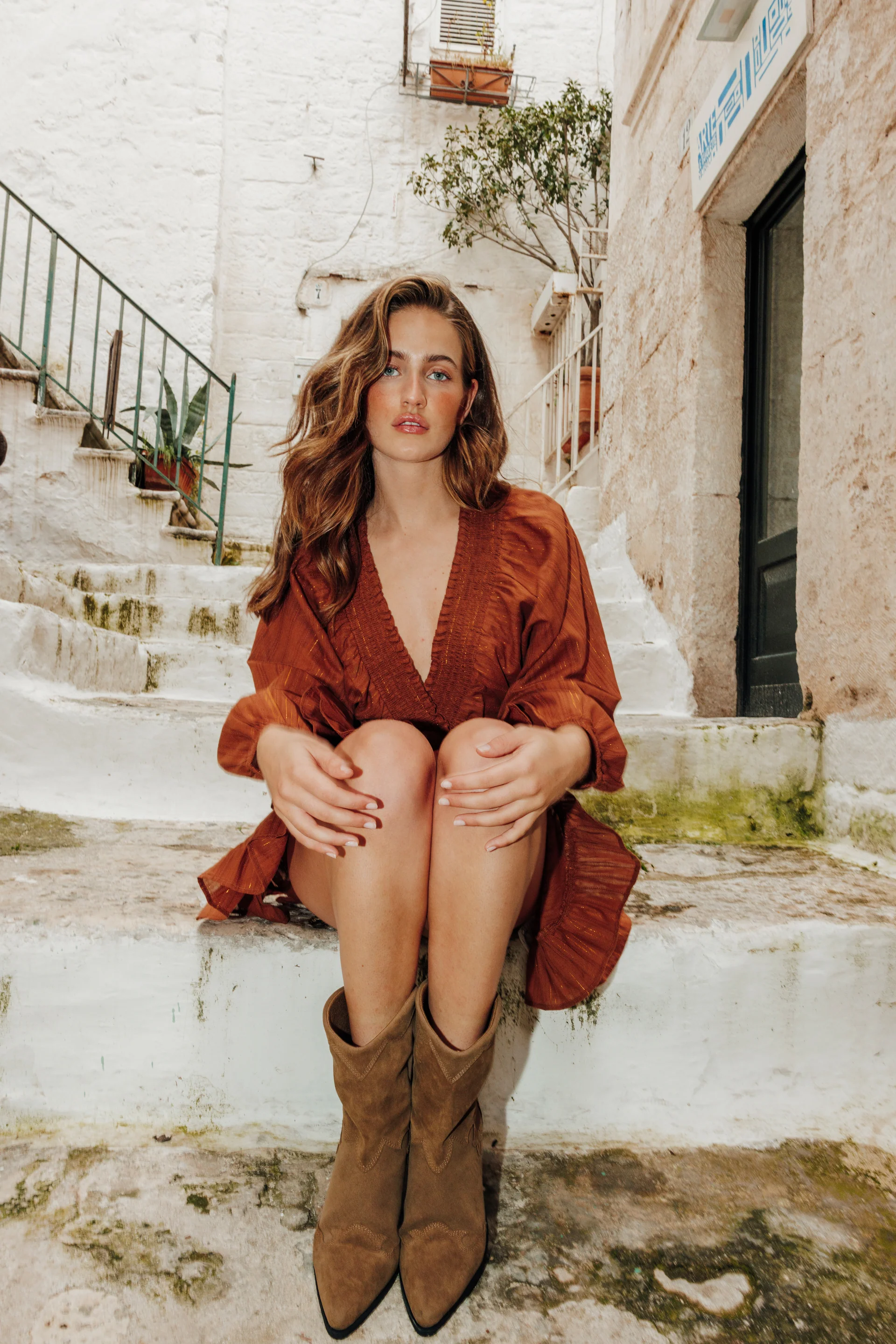 Blouse en jean sans manches avec volant et nouettes