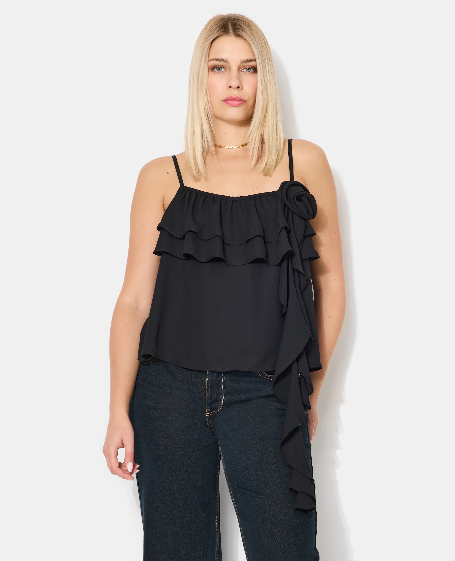 Top en voile à bretelles avec volants, fleur et pans
