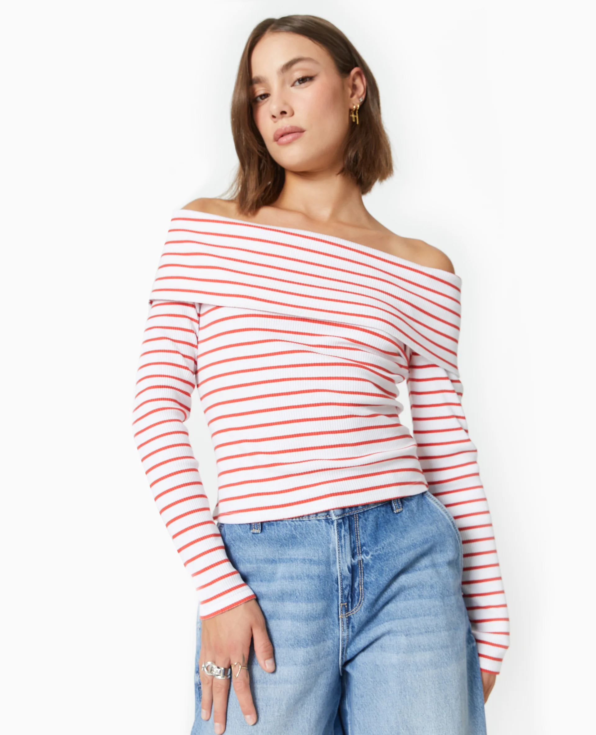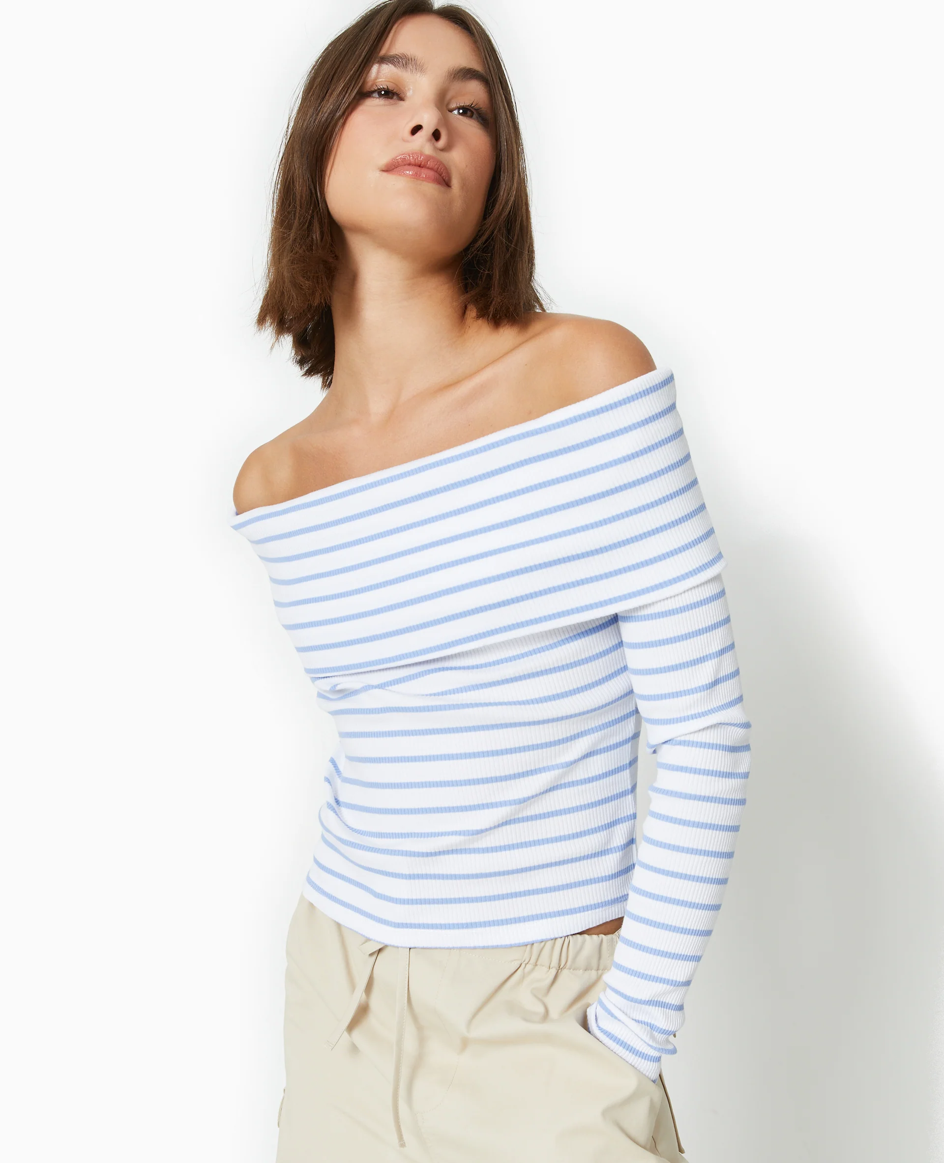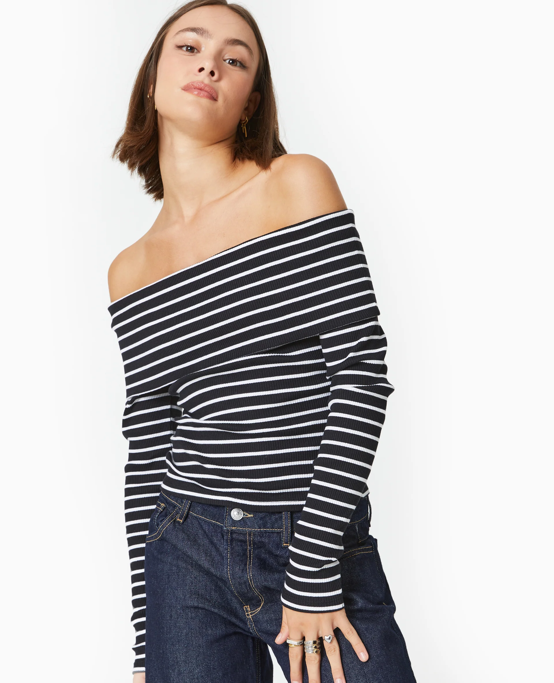 Top en maille côtelée encolure Bardot rayé