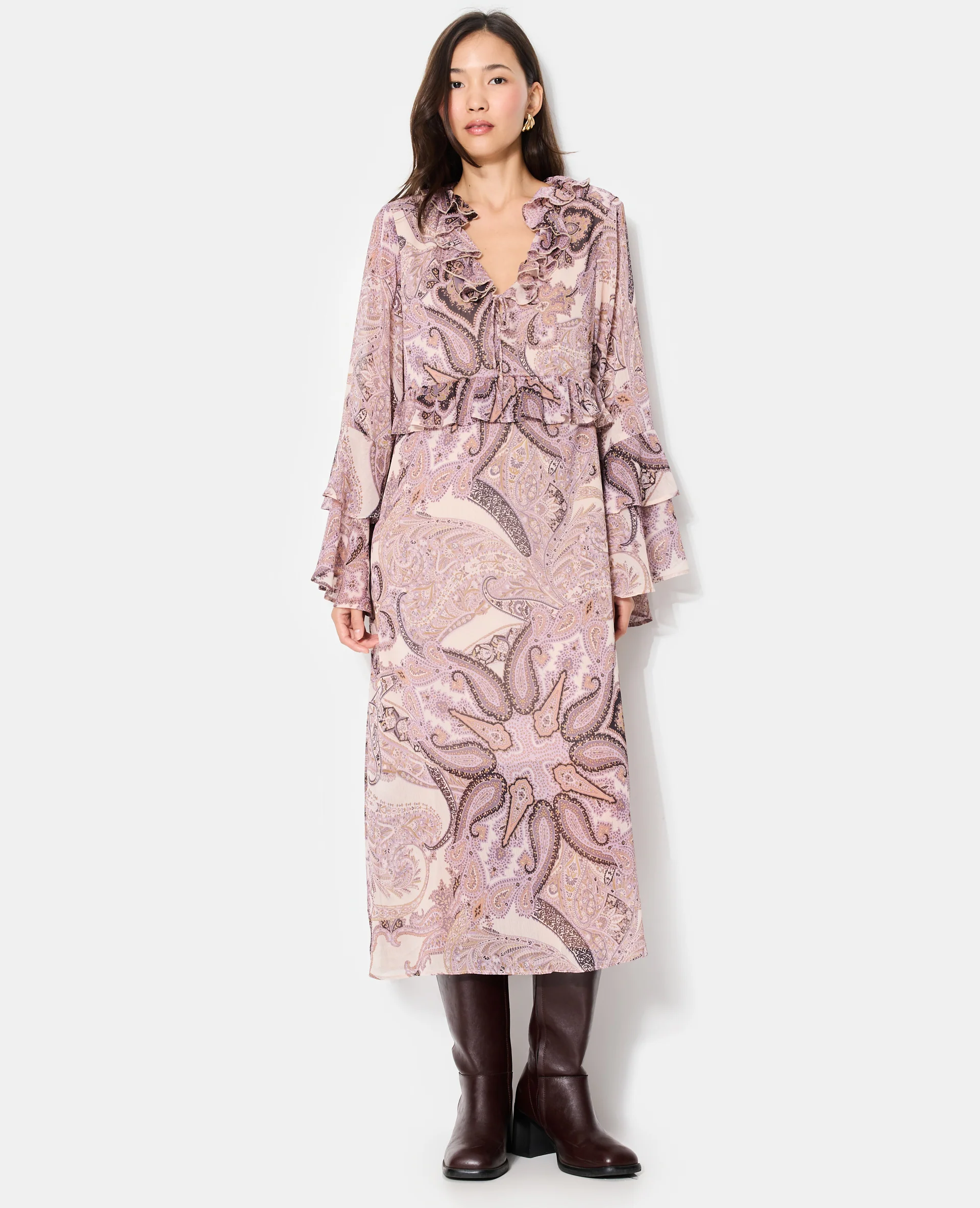 Robe longue en voile avec volants et motif cachemire