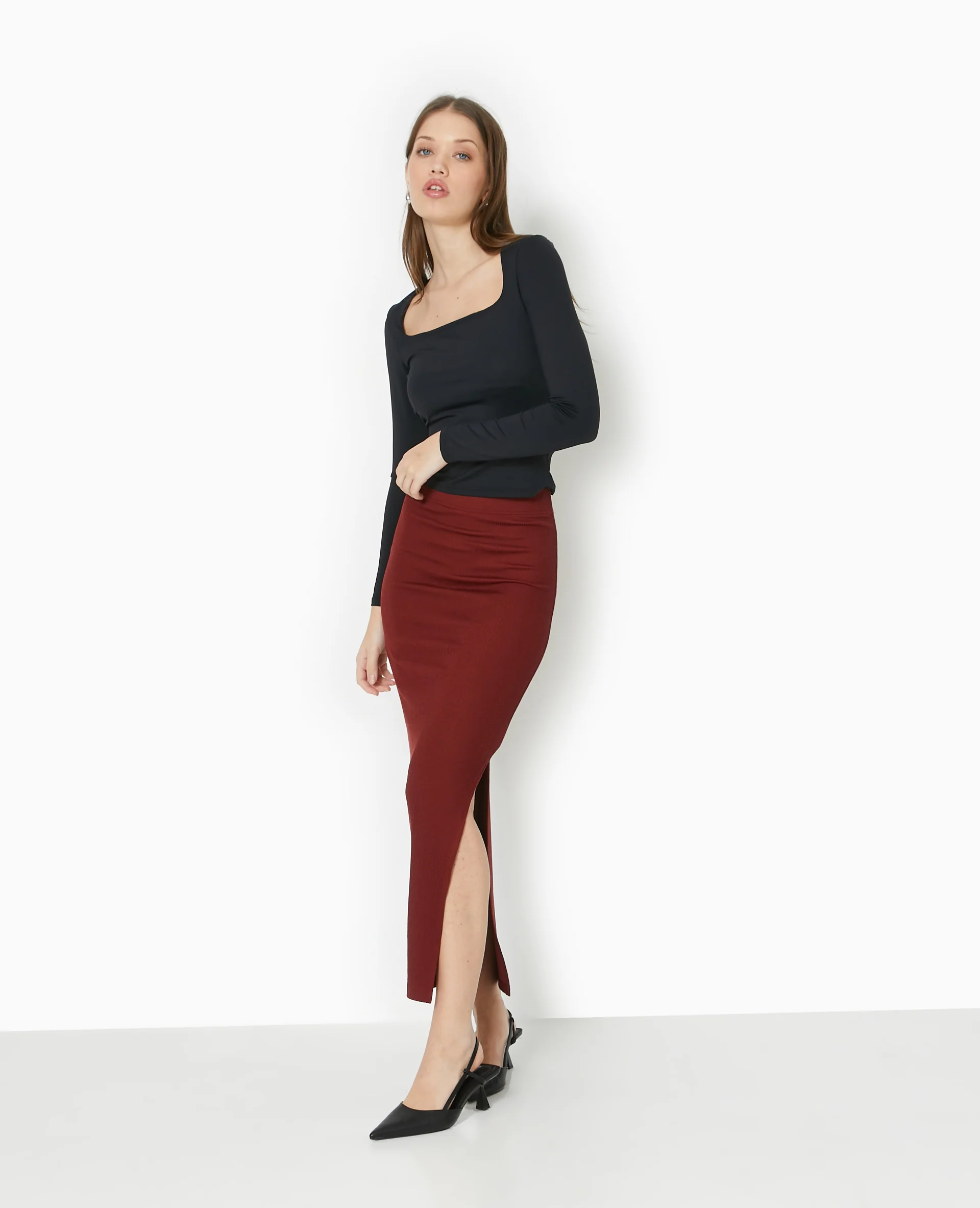 Jupe tube longue en maille côtelée